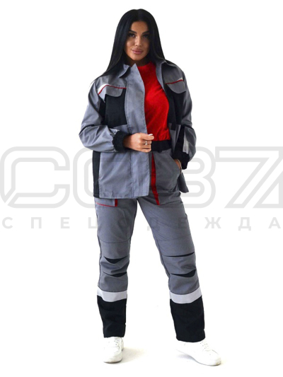 Костюм рабочий женский "Кейп" с СОП цв.серый/чёрный/красный тк.смесовая (куртка+брюки) в Томске